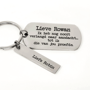 ... Ik heb nog nooit verlangd naar aandacht Sleutelhanger. Op veler verzoek is het nu mogelijk om ook een eigen tekst op de dogtag te zetten. Wie ga jij verrassen met deze unieke gepersonaliseerde sleutelhanger?