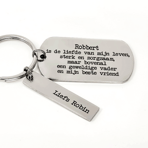 ... Is de liefde van mijn leven Sleutelhanger. Op veler verzoek is het nu mogelijk om ook een eigen tekst op de dogtag te zetten. Wie ga jij verrassen met deze unieke gepersonaliseerde sleutelhanger?