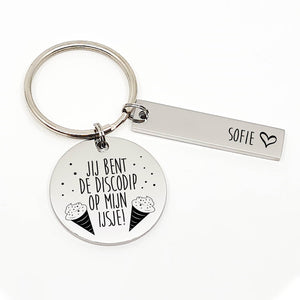 Als jouw geliefde jou compleet maakt door de discodip te zijn op jouw ijsje dan is dit het perfecte cadeau! Laat jou geliefde weten hoeveel je van hem/haar houd met deze handgemaakte 'Jij Bent De Discodip Op Mijn IJsje' sleutelhanger. Je kunt hem personaliseren door er je eigen naam aan toe te voegen!