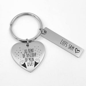 Als jouw geliefde jou compleet maakt door de discodip te zijn op jouw ijsje dan is dit het perfecte cadeau! Laat jou geliefde weten hoeveel je van hem/haar houd met deze handgemaakte 'Jij Bent De Discodip Op Mijn IJsje' sleutelhanger. Je kunt hem personaliseren door er je eigen naam aan toe te voegen!