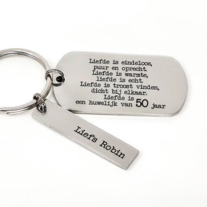 Na 50 jaar nog steeds dol verliefd op elkaar? veras je geliefde dan met deze handgemaakte sleutelhanger. De sleutelhanger is te personaliseren met een naam, het perfecte cadeau.