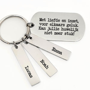opzoek naar een mooi huwelijks cadeau? dan is dit de perfecte sleutelhanger. deze mooie RVS sleutelhanger is met veel zorg hand gemaakt en kan worden gepersonaliseerd met eigen namen. zo maak je dit mooie cadeau nog beter!