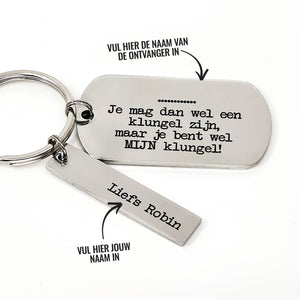 Je mag dan wel een klungel zijn maar wel mijn klungel! Sleutelhanger. Op veler verzoek is het nu mogelijk om ook een eigen tekst op de dogtag te zetten. Wie ga jij verrassen met deze unieke gepersonaliseerde sleutelhanger?