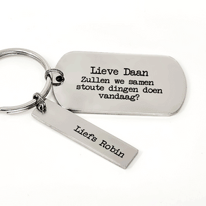 ... Zullen we samen stoute dingen doen vandaag? Sleutelhanger. Op veler verzoek is het nu mogelijk om ook een eigen tekst op de dogtag te zetten. Wie ga jij verrassen met deze unieke gepersonaliseerde sleutelhanger?