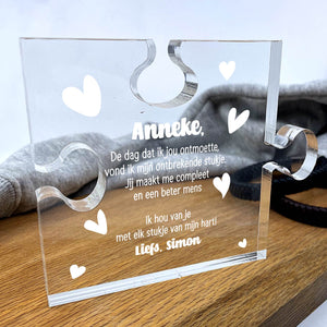 Doe vandaag nog een prachtig plexiglas puzzelstukje cadeau. Compleet gepersonaliseerd met eigen namen.