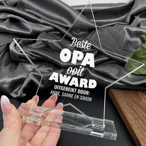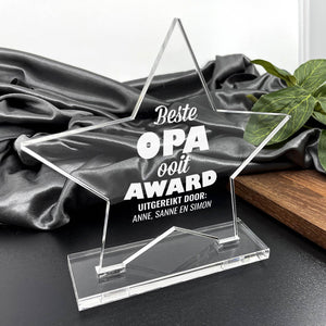 Zet opa dit jaar in het zonnetje met zijn eigen award van plexiglas. Compleet gepersonaliseerd met namen van de kleinkinderen. Een uniek cadeau!