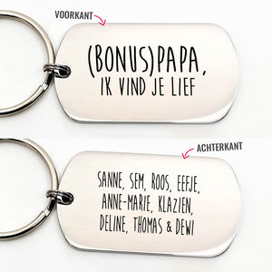 Jou Bonuspapa is is er altijd voor jou, hij houd je hand vast als je bang bent en lacht met je als je blij bent. Met hem is het altijd leuk. veras jou bonuspapa daarom met deze mooie handgemaakte "(Bonus)papa ik vind je lief" RVS sleutelhanger, en personaliseer hem met de namen van zijn (bonus)kinderen. Daar gaat jou Bonuspapa zeker blij van worden!