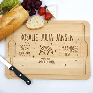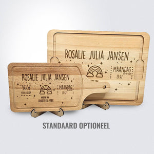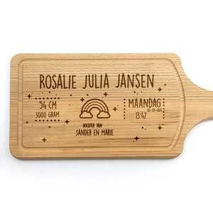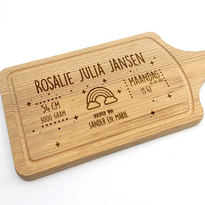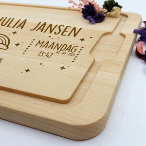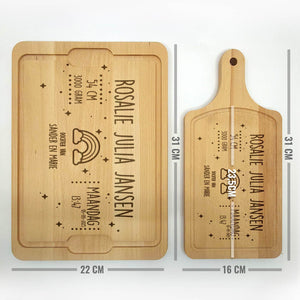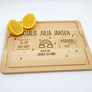 Deze persoonlijke geboorteplank is een uniek kraamcadeau om te geven. Je kunt van het gewicht van de baby tot aan de namen van de ouders zelf personaliseren. Een geschenk voor het leven!