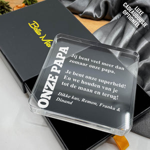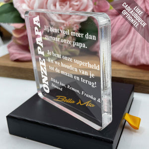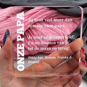 Doe vandaag nog een prachtig plexiglas Aandenken met persoonlijke boodschap cadeau. Lasergegraveerd met eigen namen en een dikte van 1 cm.