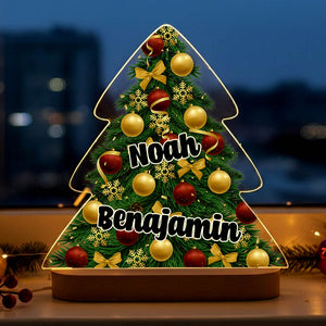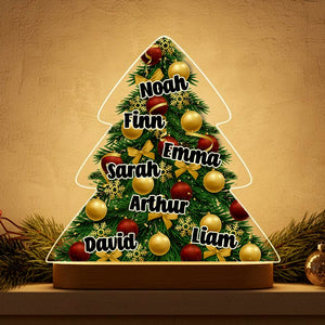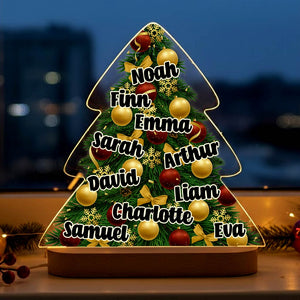 Kleurrijke kerstboom met alle namen van de familie erin!