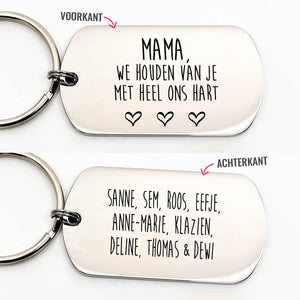 Mama is de liefste, mama is er altijd voor jou om je te troosten, knuffelen of gewoon met goed advies. Veras mama met deze mooie handgemaakte "Mama we houden van je met heel ons hart" RVS sleutelhanger. Door namen toe te voegen word dit een nog persoonlijker cadeau