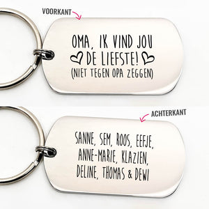 Bij oma kan je altijd terecht, voor een dikke knuffel of een gezellig praatje, maakt niet uit. Jouw oma is er. Laat haar weten dat je van haar houd en geef haar nu dit originele 'Oma ik vind jou de liefste! (niet tegen opa zeggen)' sleutelhanger cadeau. Je kunt de sleutelhanger personaliseren door al haar kleinkinderen er op te zetten.