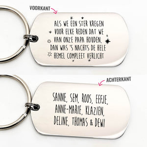 Jou papa is jou alles. Je gaat samen op avontuur of speelt gezellig een spelletje aan de keukentafel. Met papa is het altijd leuk. veras jou papa daarom met deze mooie handgemaakte "Papa als we een ster kregen voor elke reden dat we van onze papa houden dan was 's nachts de hele hemel compleet verlicht" RVS sleutelhanger, en personaliseer hem met de namen van papa's kinderen. Daar gaat jou papa zeker blij van worden!