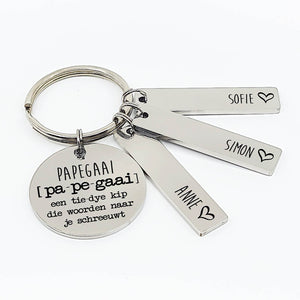 Schreeuwt jou papagaai ook de gekste woorden naar jou? Dan is deze 'Papagaai, een tie-dye kip die woorden naar je schreeuwt' RVS Sleutelhanger zeker wat voor jou! Speciaal gemaakt voor de echte papagaai lovers. Dit cadeau kan je personaliseren door al je vogelkindjes er aan te laten maken! Zo kun je ze altijd bij je dragen.