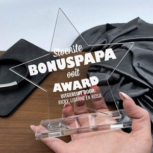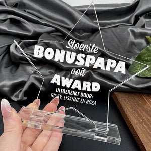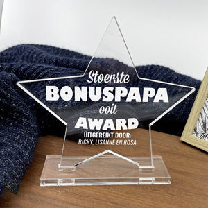 Zet jouw bonuspapa dit jaar in het zonnetje met zijn eigen award van plexiglas. Compleet gepersonaliseerd met namen van de kinderen. Een uniek cadeau!