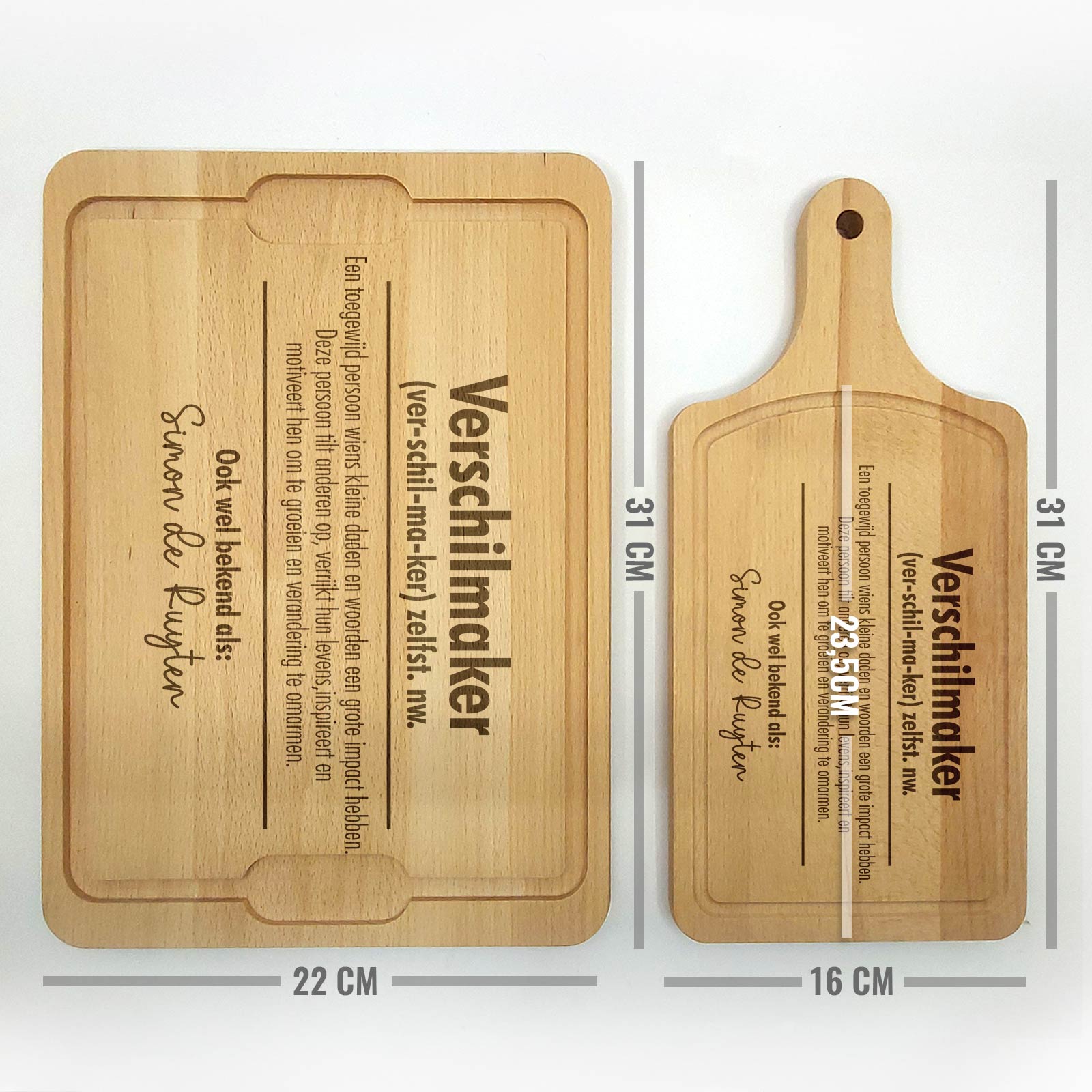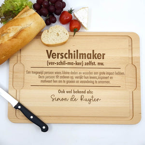 Let op: Hout is een natuurproduct. Hierdoor zal elke gravure iets afwijken van de foto's. Dit komt simpelweg omdat de nerf van het hout bepaald hoe donker de gravure wordt. Dit maakt elke borrelplank wel 100% uniek!